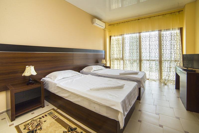 Пансионат имеет два корпуса: 9-этажный, отремонтированный в 2009 году, и новый 3-х этажный с живописным видом на море. Гости размещаются в комфортабельных двухместных номерах категорий «полулюкс» и «стандарт». С балконов открывается потрясающая панорама моря и Кавказских гор. В номерах – санузлы с душем, холодильники, телевизоры и кондиционеры.