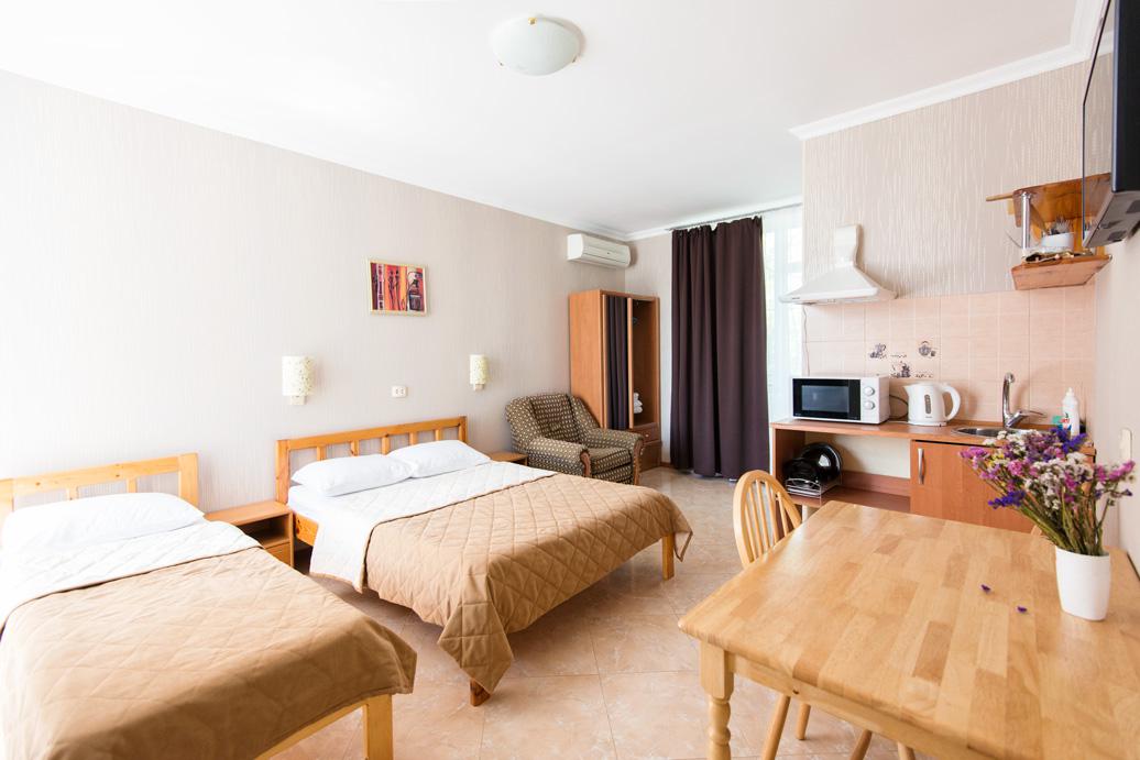 | Мебель, оборудование: | двуспальная или раздельные кровати, шкаф, прикроватные тумбочки, холодильник, ТВ, кондиционер. В некоторых номерах - мини-кухня. |