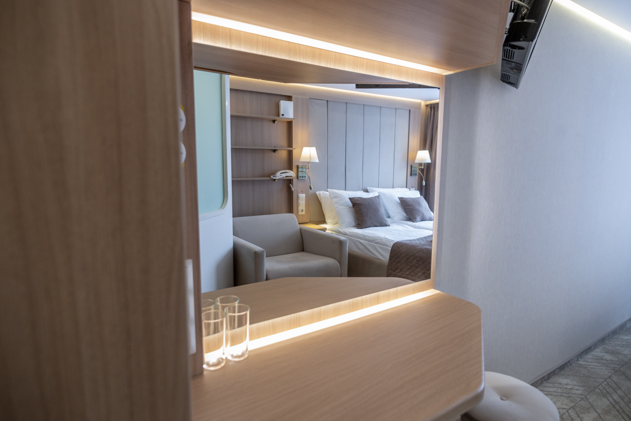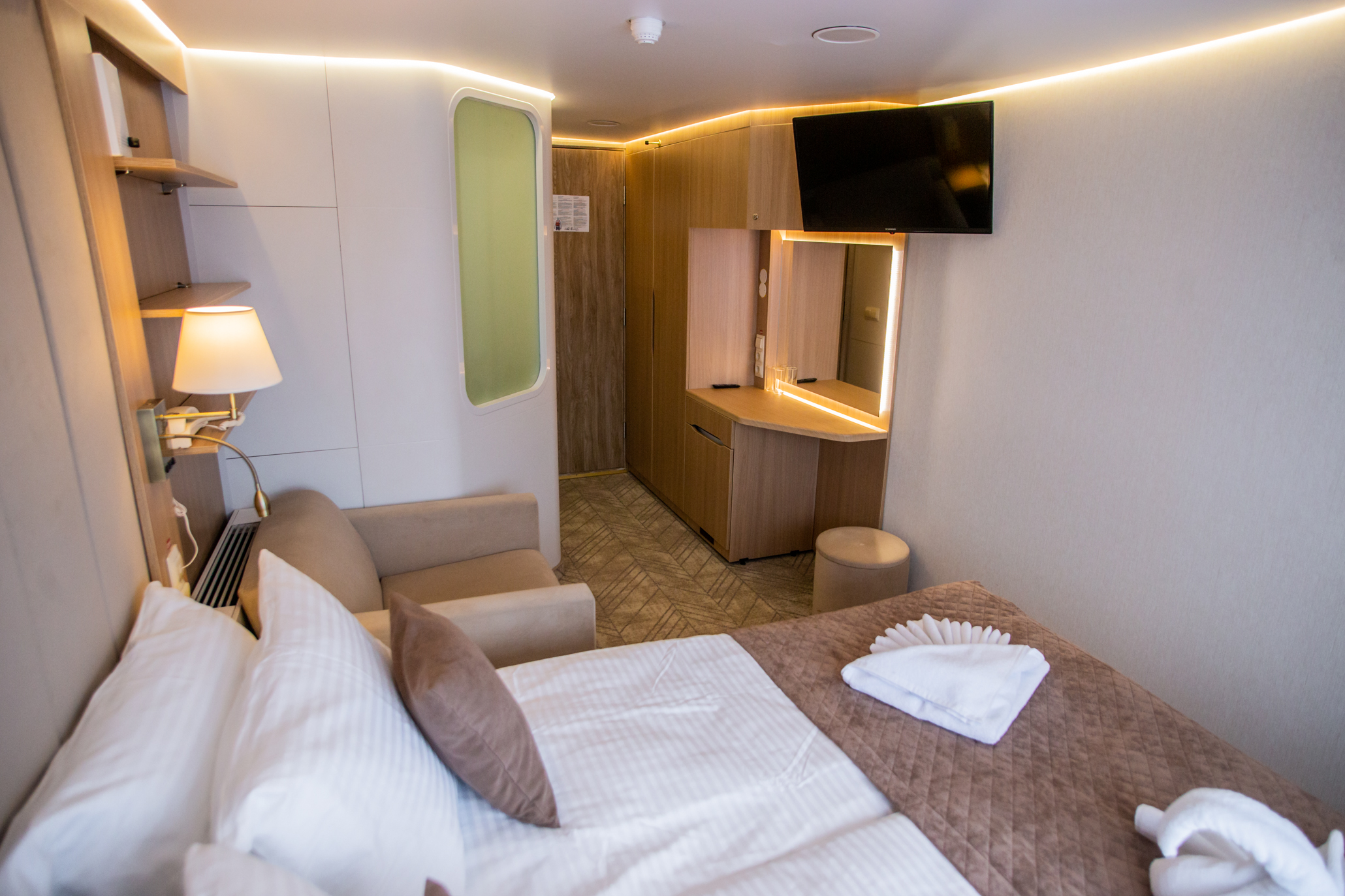 Удобства для отдыха в каюте категории «Сьют с террасой» (частная зона в носовой части корабля):
