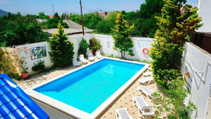 Гостевой дом "Солнечный рай" располагает большой территорией, на которой есть места для отдыха, фонтан, летние веранды, большой, глубокий открытый бассейн с шезлонгами. Бассейн оснащен современной системой очистки. С подогревом.