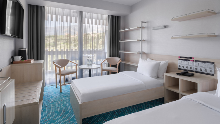 2-местный стандарт улучшенный (раздельные кровати) (макс. 2+1 чел., 18 кв. м, Wi-Fi, телевизор, кондиционер, умывальник, фен, холодильник, балкон, сейф, телефон, 1-спальные кровати, душевая кабина, туалет). Доп. место - еврораскладушка / детская кровать.