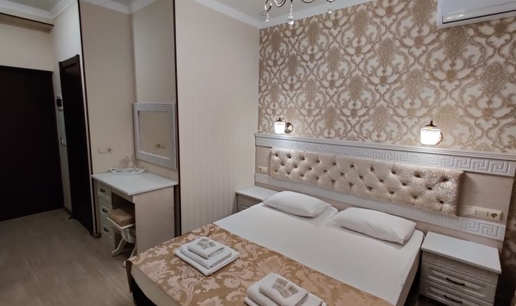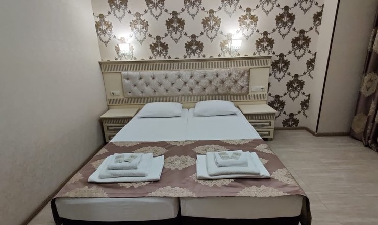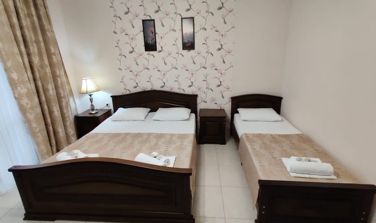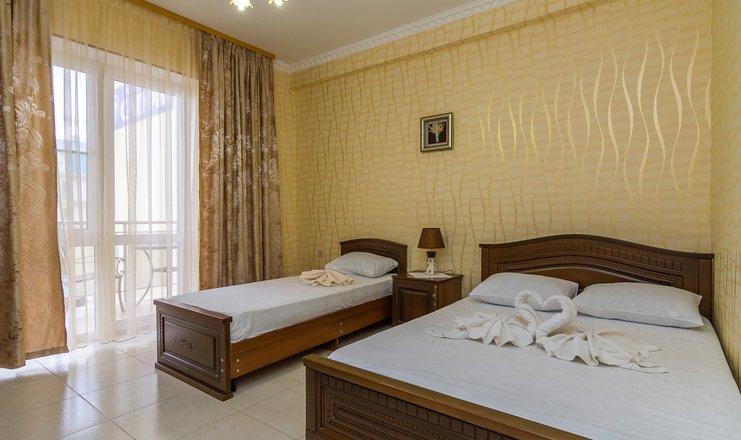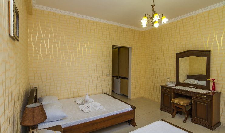 Номера: просторное помещение в теплых тонах, площадью 18-20м2 с жк-телевизором, холодильником, сплит-системой. Возможна организация дополнительного спального места. В обстановке: двуспальная или две односпальные кровати, раздвижной диван, прикроватные тумбы с ночниками, косметический, журнальный столики, комод, шифоньер. В туалетной комнате – душевая кабинка, фен. Большие окна, балкон . Обстановка номера зависит от количества проживающих гостей.